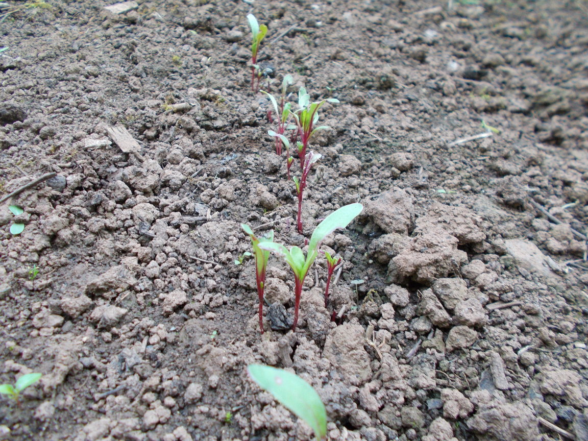 The beetroot and spinach have come up. They need to be thinned so that they have room to grow to a good size. I worked out the spacings at the start of the growing season, so I know beetroot should be about 10cm (4 in) apart, and spinach 8cm apart.